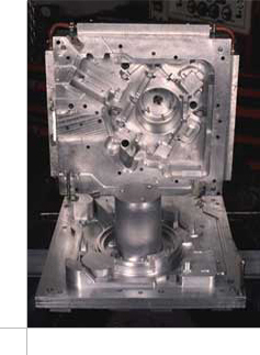 As the design was not complete for the housing and the schedule was compressed, a handmade pattern was started with revision changes added on the fly. The upper part that formed an air vent chamber and included cover mount bosses had to be molded with a side pull. The schedule allowed this feature to wait for final geometry and an aluminum plug was machined out of solid and fitted to the spray metal section during final mold assembly. This decision also helped the long-term mold integrity and stability during the extended RIM prototype production phase.